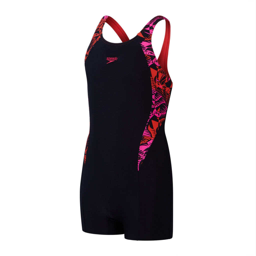 The Girls Print Panel Legsuit from Speedo is perfect from regular swimming lessons to fun beach sessions for young swimmers who prefer more coverage. The splashback design allows straps to set away from the shoulders to increase freedom of movement and the shape retention fabric stretches to provide great comfort and prevent feeling restricted in the water. The swimsuit is made from Eco EnduraFlex fabric and provides higher chlorine resistance.