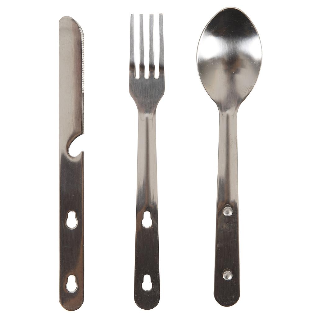 This interlocking knife fork and spoon set are easy to separate then re-fasten so your cutlery stays together in your pack.